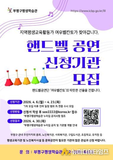 부평구평생학습관은 지역사회 문화복지 확대와 평생교육 활성화를 위해 ‘핸드벨 파견공연’ 신청기관을 4월 6일부터 23일까지 모집한다.