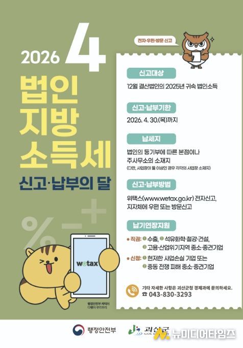 충북 괴산군은 오는 30일까지 2025년 귀속 사업연도 소득에 대한 ‘법인지방소득세 집중신고기간’을 운영한다고 1일 밝혔다.