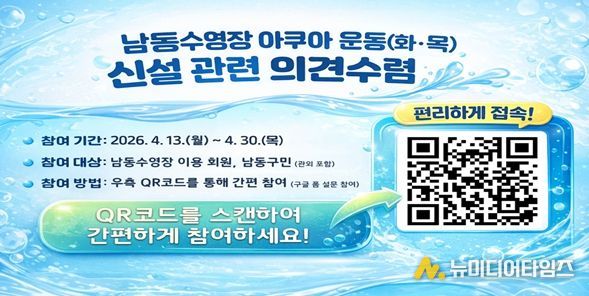 공단은 프로그램 신설에 앞서 이용자 의견을 반영하기 위해 오는 4월 13일부터 4월 30일까지 약 3주간 의견 수렴을 실시한다. 설문은 남동수영장 이용 회원뿐 아니라 남동구민 및 관외 이용자 누구나 참여할 수 있으며, 공단 홈페이지 및 수영장 게시판, QR코드 기반 온라인 설문을 통해 진행된다.