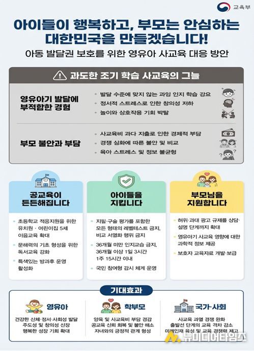 교육부)는 4월 1일‘아동 발달권 보호를 위한 영유아 사교육 대응 방안’을 발표한다. 이는 ‘4세·7세 고시’ 현상 등 비정상적으로 확장된 영유아 사교육 시장을 바로잡고, 과도한 조기 경쟁과 선행 학습으로 인한 발달 저해, 정서적 부담 가중 등 아동학대적 양상까지 나타나는 상황에 대응하기 위해서이다.