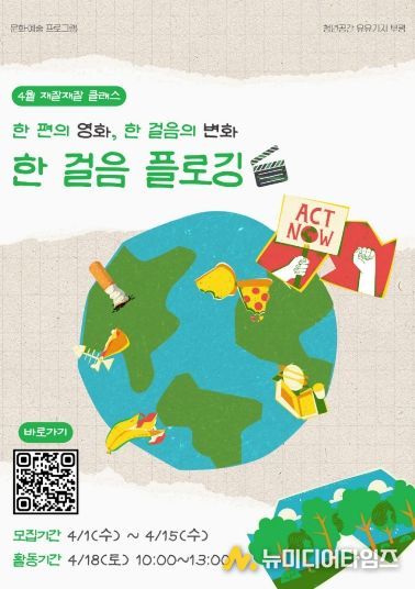 이번 4월 프로그램 ‘한 걸음 플로깅’은 오는 18일 오전 10시부터 3시간 동안 진행된다. 1부에서는 다큐멘터리 영화 ‘문명의 끝에서’(서울국제환경영화제 대상 수상작) 상영 후 임기웅 감독과 대화의 시간이, 2부에서는 갈산천, 굴포천, 청리단길 일대에서 플로깅 활동을 펼칠 예정이다.