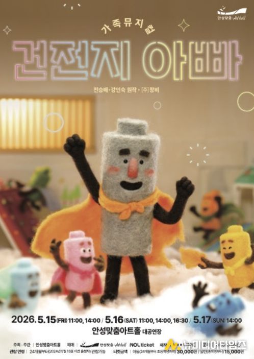 가족뮤지컬 '건전지 아빠'는 5월 15일부터 17일까지 3일간 무대에 오른다. 주말뿐만 아니라 평일 오전 시간대를 포함해, 다양한 가족 형태가 각자의 리듬에 맞춰 공연장을 찾을 수 있도록 일정을 배치했다.