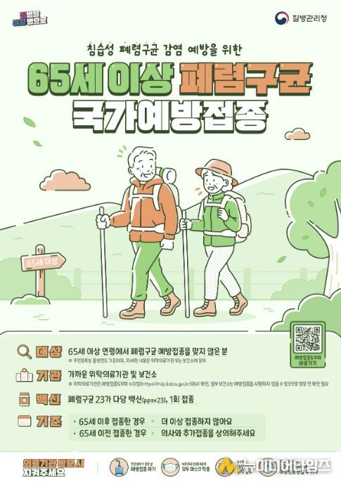 접종 대상은 65세 이상(1961년 12월 31일 이전 출생자) 어르신 중 폐렴구균 예방접종을 한 번도 받지 않은 경우로, 폐렴구균23가 다당 백신(PPSV23)을 1회 무료로 접종받을 수 있으며, 주소지와 관계없이 전국 보건소와 위탁의료기관에서 접종이 가능하다.