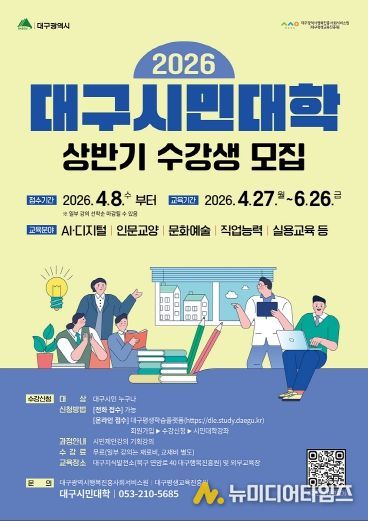대구광역시는 시민의 평생학습 기회를 확대하고 변화하는 학습 수요를 반영해 4월 8일부터 ‘2026년 상반기 대구시민대학’ 수강생을 모집한다.
