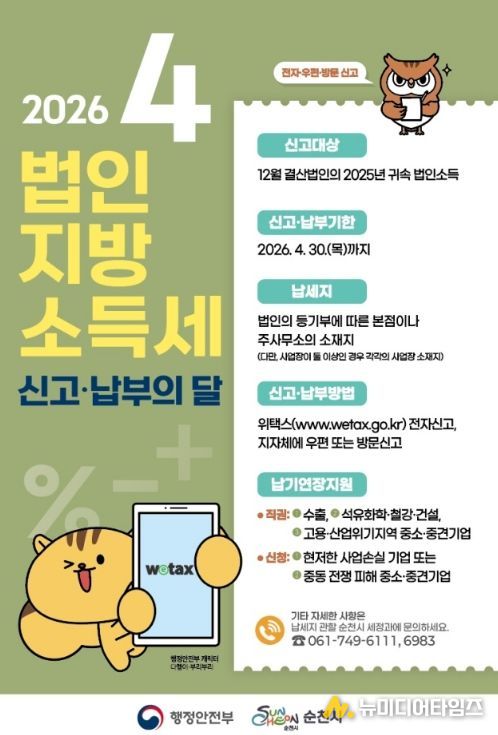 순천시는 4월 한 달을 법인지방소득세 집중 신고·납부 기간으로 운영하며, 관내 법인들은 4월 30일까지 신고·납부를 완료해 줄 것을 당부했다.