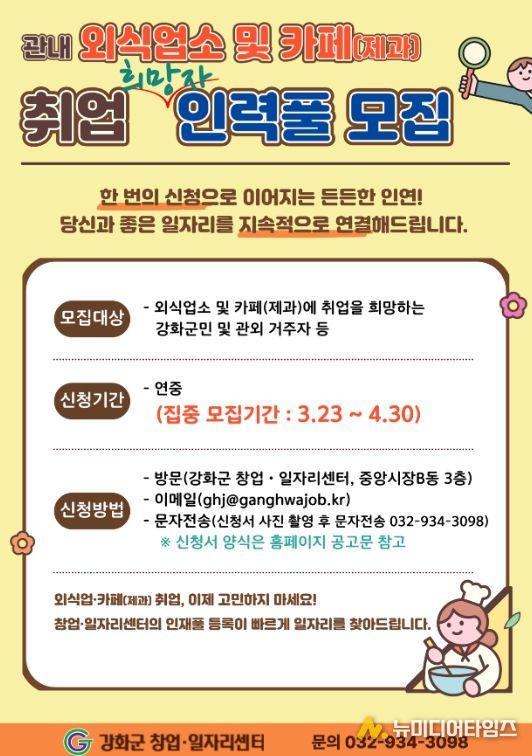 이에 센터는 강화군 및 강화군 외식업지부와 협력해 외식업 취업을 희망하는 구직자를 상시 모집하고, 인력풀을 기반으로 적시에 구인·구직을 연결하는 체계적인 취업 지원 서비스를 운영한다는 계획이다.