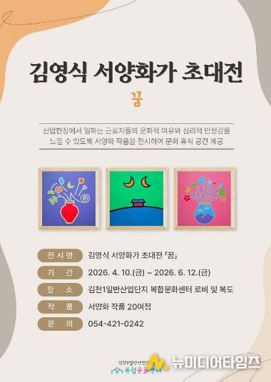 김천시는 김천1일반산업단지 복합문화센터에서 지역 예술가 김영식 작가의 기획초대전 '꿈'을 오는 4월 10일부터 6월 12일까지 개최한다고 밝혔다.
