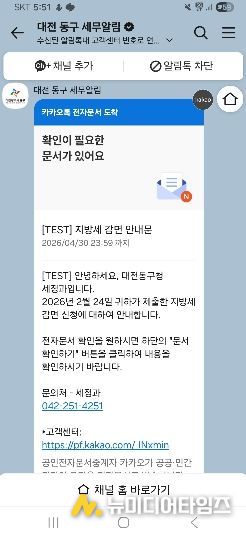 대전 동구는 이달부터 납세자 권익 보호를 위한 시책의 일환으로 ‘지방세 감면 유예기간 알림톡 서비스’를 본격 추진한다고 7일 밝혔다.