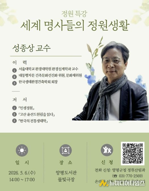 양평군은 ‘2026 제14회 경기정원문화박람회’에 대한 관심 제고를 위해 ‘정원교육 특강: 세계 명사들의 정원생활’ 참여자를 모집한다고 밝혔다.