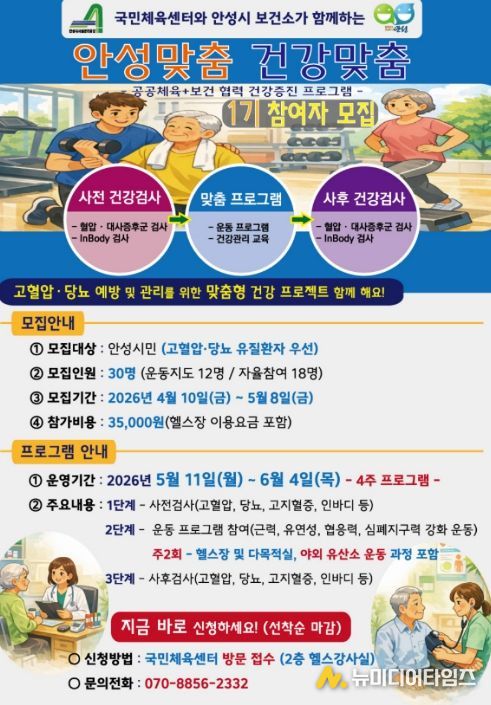 모집 대상은 운동 프로그램 참여가 가능한 안성시민으로, 당뇨·고혈압 등 만성질환 유증상자를 우선 모집한다. 접수 기간은 4월 10일부터 5월 8일까지이며, 국민체육센터 헬스 강사실에서 선착순으로 신청할 수 있다.