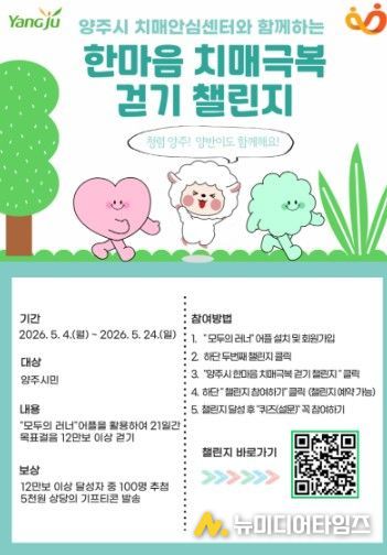 이번 행사는 비대면 방식으로 진행되며, 모바일 앱 ‘모두의 러너’를 통해 참여할 수 있다. 앱 내 ‘챌린지’ 탭에서 ‘양주시 한마음 치매극복 걷기 챌린지’를 선택한 뒤 참여 버튼을 누르면 신청이 완료되며, 사전 예약도 가능하다.