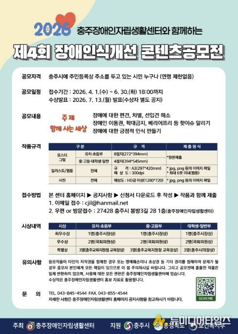 충주장애인자립생활센터는 제46회 장애인의 날을 맞아 장애에 대한 사회적 이해와 공감을 높이고, 차별 없는 지역사회를 조성하기 위한 ‘2026년 장애인식개선 콘텐츠 공모전’을 개최한다.