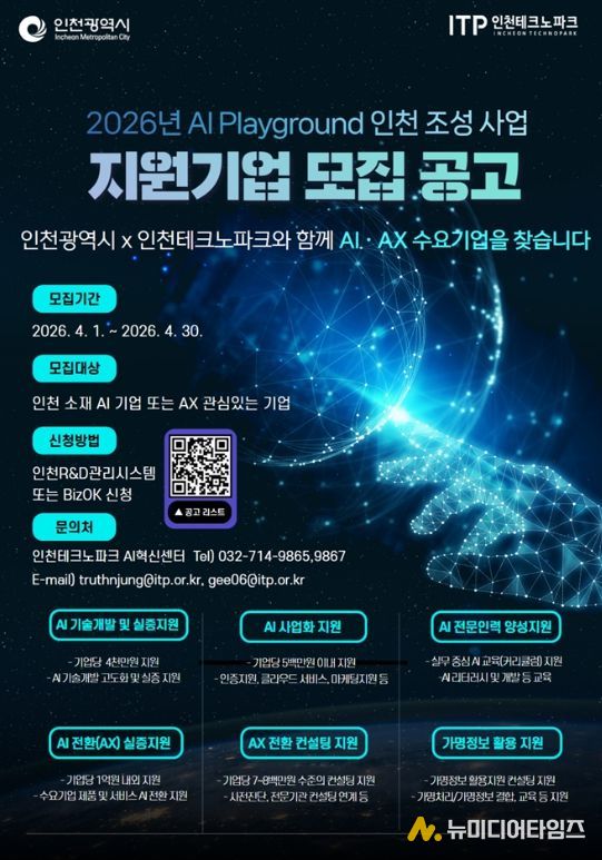 인천테크노파크(인천TP)는 지역 중소기업의 인공지능 전환(AX) 촉진과 산업 경쟁력 강화를 위해 ‘2026년 AI 플레이그라운드 인천 조성사업’의 참여기업을 오는 30일까지 모집한다고 밝혔다.