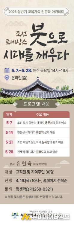 부산광역시립중앙도서관은 오는 5월 7일부터 28일까지 매주 목요일마다 4회에 걸쳐 교직원 및 지역주민 30명을 대상으로 온라인(ZOOM)을 통해 인문학 아카데미 ‘조선 르네상스, 붓으로 시대를 깨우다’를 운영한다.