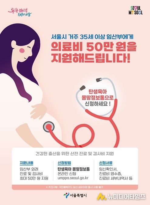 고령 출산 증가로 임신‧출산 의료비 부담이 커지는 가운데, 서울시에 거주 하는 35세 이상 임산부라면 임신 기간 동안 발생한 외래 진료 및 검사비 를 최대 50만 원까지 지원받을 수 있다.