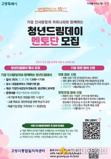 고양특례시는 청년들의 취업 경쟁력 강화를 위한 프로그램 ‘청년드림데이’개최를 앞두고, 기업 인사담당자를 대상으로 한 일자리 멘토단을 모집한다.