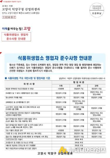 덕양구 관계자는 “이번 안내문 배부를 통해 식품위생법 주요 위반사항과 변경된 규정을 적극 안내하고, 영업자의 위생관리 역량을 높이고자 한다”며 “기온 상승으로 식중독 발생 위험이 높아지는 시기인 만큼 예방 수칙 홍보를 병행해 안전한 식품위생 환경 조성에 최선을 다하겠다”고 밝혔다.