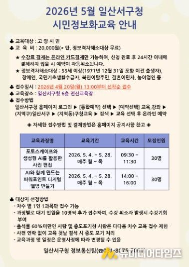 교육은 5월 4일부터 5월 28일까지 매주 월요일부터 목요일까지 진행되며, 과정별 30명을 모집한다. 교육 장소는 일산서구청 6층 전산교육장이다.