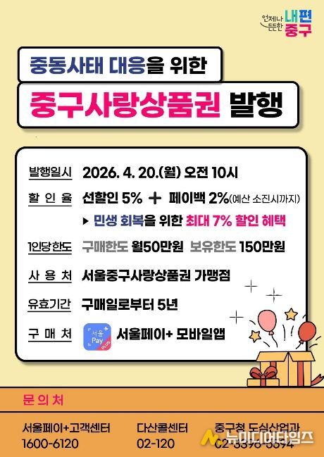 서울 중구가 중동전쟁으로 인한 경기 불안과 소비 위축에 대응하기 위해 20억 원 규모의 '서울중구사랑상품권'을 오는 20일 발행한다.