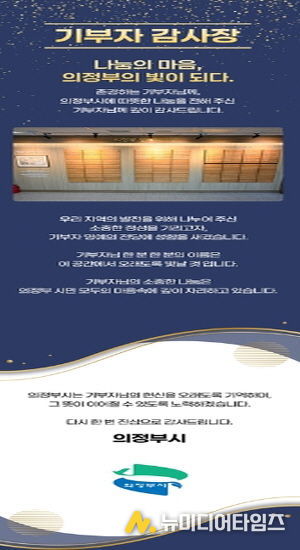 시 관계자는 “기부자 여러분의 애정 어린 관심과 참여가 의정부의 미래를 밝게 이끌어 주고 있다”며 “앞으로도 기부자 한 분 한 분의 마음을 귀히 새기며, 기부 문화가 더욱 확산될 수 있도록 최선을 다하겠다”고 말했다.