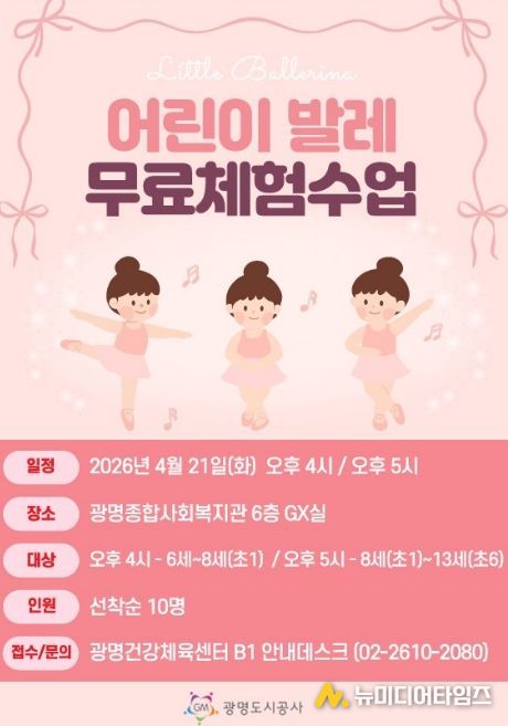 운영 프로그램은 K-POP 댄스와 어린이 발레 2개 종목으로 구성된다. 상세 일정은 ▲어린이 발레 4월 21일 ▲K-POP 댄스 4월 22일이며, 광명종합사회복지관 6층 GX실에서 진행될 예정이다.