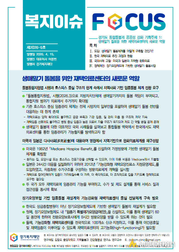 경기복지재단(대표이사 이용빈)은 생애말기 돌봄체계 전환과 재택의료센터의 역할 재정립을 주제로 한 「복지이슈포커스 제5호」 보고서를 발간했다.