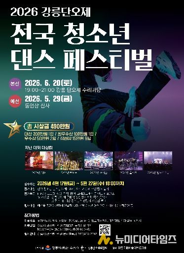 강릉시 청소년수련관은 오는 6월 20일 오후 7시 강릉단오제 수리마당에서 개최되는 ‘2026 강릉단오제 전국 청소년 댄스 페스티벌’의 참가팀을 17일부터 5월 27일까지 모집한다.