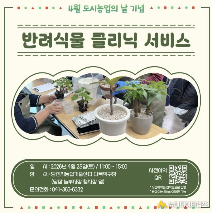 당진시는 4월 도시농업의 날을 기념하고 도시농업을 널리 알리기 위해 오는 25일 오전 11시부터 오후 3시까지 농업기술센터 다목적구장에서 ‘반려식물 클리닉 서비스’를 운영한다고 17일 밝혔다.