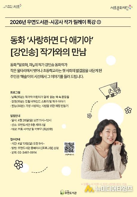 먼저 오는 26일에는 동화 ‘사랑하면 다 애기야’의 강인송 작가가 나선다. 작가가 직접 들려주는 집필 비하인드 스토리를 시작으로 주요 장면 함께 읽기, 편지 쓰기, 나만의 애칭 만들기 등 아이들의 눈높이에 맞춘 다채로운 체험 활동이 이어질 예정이다.