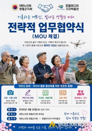 대한노인회 영월군지회(지회장 엄기원)와 영월미디어기자박물관은 어르신 문화활동과 기록문화 확산을 위한 전략적 업무협약(MOU)을 체결한다.