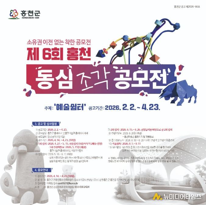 홍천군은 자연 속에서 머물며 쉬어갈 수 있는 공공예술 공간 조성을 위해 '제6회 홍천동심조각공모전' 작품을 모집한다. 작품 접수는 2026년 4월 23일까지 진행한다.