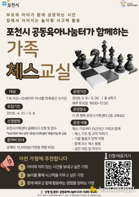 포천시 더 큰 행복 포천시가족센터는 공동육아나눔터 상시 프로그램의 일환으로 아동의 논리적 사고력 향상과 부모-자녀 간 긍정적 상호작용을 지원하기 위해 가족 참여형 체스 프로그램 '가족 체스 교실'을 운영한다고 밝혔다.