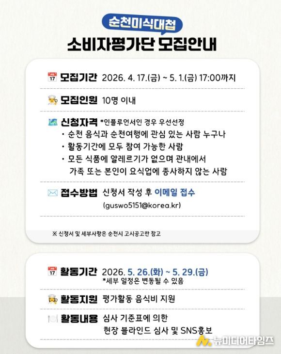 소비자 평가단은 총 10명 이내로 선발되며, 순천 음식과 여행에 관심 있는 사람이라면 누구나 지원할 수 있다.