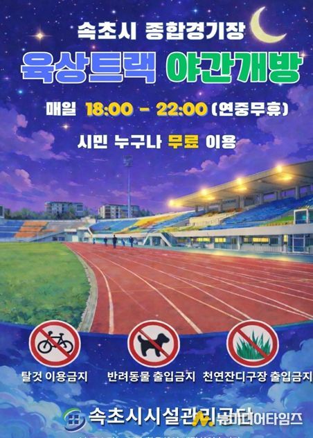 속초시시설관리공단(이사장 이선규)은 오는 4월 20일부터 노학동 종합경기장 내 육상트랙을 시민들에게 야간 개방한다고 밝혔다.