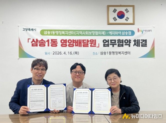 고양특례시 삼송1동은 지난 16일 취약계층의 건강과 안부를 동시에 살피는 ‘영양배달원’사업 추진을 위해 지역사회보장협의체와 ㈜에치와이 고양 삼송지점이 업무협약을 체결했다.