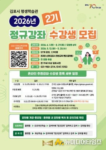 김포시가 시민의 평생학습 참여 기회를 확대하고 변화하는 사회 환경에 대응할 수 있는 역량 강화를 위해 ‘2026년 2기 평생교육 정규강좌’ 수강생을 모집한다고 밝혔다.