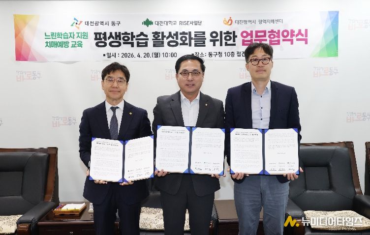 대전 동구는 20일 대전대학교 RISE사업단‧대전시치매센터와 ‘느린학습자 평생교육 지원’과 ‘치매예방 프로그램 운영’을 위한 업무협약을 체결했다고 밝혔다.