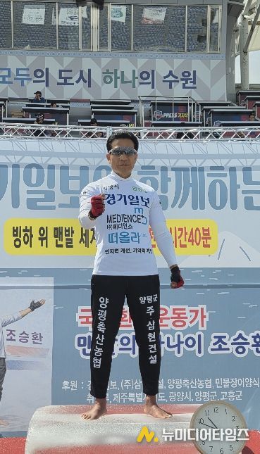 이날 조승환 씨는 오전 7시에 도전을 시작해 오후 12시 40분까지 5시간 40분 동안 얼음 위에서 맨발로 버티며, 지난 1월 세운 본인의 기록(5시간 35분)을 5분 경신했다.