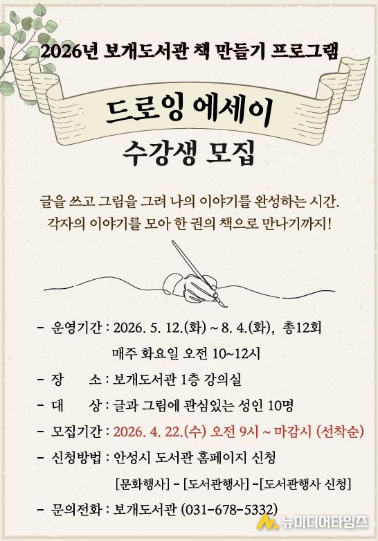 안성시 보개도서관(책문화센터)이 시민들의 창작 활동을 지원하고 일상 속 예술 경험을 확대하기 위해 오는 5월부터 ‘드로잉 에세이’와 ‘포토 에세이’ 책 만들기 프로그램을 새롭게 운영한다고 밝혔다.