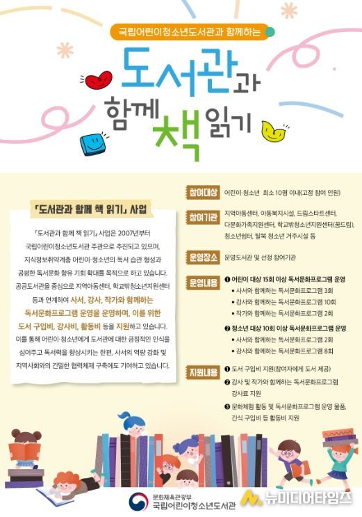 ‘도서관과 함께 책 읽기’는 지식정보 취약계층 어린이를 대상으로 독서문화 활성화를 위해 프로그램을 운영할 수 있도록 국립어린이청소년도서관이 예산 등을 지원하는 사업으로, 전국 공공도서관 120개관(어린이 대상 110개관, 청소년 대상 10개관)에서 함께 추진된다.