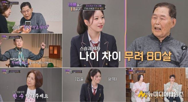 연습도 필요 없다는 아버지가 걱정이 된 딸 전수경은 “실수해서 ‘땡’하면 안 되니까 선생님을 모셨다”며 아버지와 함께 연습실로 향했다. ‘97세’ 전수경 아버지의 선생님이 될 주인공은 ‘트롯 공주’ 오유진이었다. 오유진은 쟁쟁한 어른들을 제치고 15살에 ‘미스트롯3’에서 미를 거머쥐었고, 현재 17세에 데뷔 6년 차에 들어섰다. 일일 선생님이 겨우 17살이라는 사실에 전수경 아버지는 깜짝 놀라 입을 다물지 못했다. 전수경은 “두 사람의 나이 차가 무려 80살이다”라며 너스레를 떨었다. ‘선생님’ 오유진의 나이를 들은 전수경 아버지는 “내가 17살에는 해방돼 가지고 만세만 부르고 돌아다녔다. 어른들이 깃대 들면 우리도 덩달아서 펄펄 뛰어다니며 흥으로 표현했다. 조금 있다가 6.25가 터졌다”며 차원이 다른 17세 시절을 고백해 스튜디오를 놀라게 했다.
