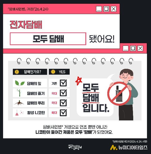 이에 따라 개정법 시행일인 24일부터는 금연구역에서 궐련형‧액상형 전자담배를 포함한 모든 담배를 피울 수 없으며, 위반 시에는 10만 원 이하의 과태료가 부과된다.
