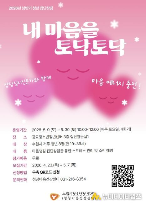 수원시청소년청년재단 청청마음건강센터는 학업과 취업준비, 직장생활 등 경쟁 중심 환경으로 인해 심리적 소진을 겪는 관내 청년들을 대상으로, 오는 5월 7일까지 전문가가 참여하는 집단상담 프로그램 ‘내 마음을 토닥토닥’ 참가자를 모집한다고 밝혔다.