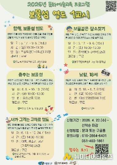 영도구 관계자는 “보물섬영도 1교시는 세대별 삶의 경험을 문화예술로 연결하는 프로그램”이라며 “구민 누구나 일상 속에서 문화예술을 즐기고 영도만의 정체성을 함께 만들어가는 계기가 되기를 기대한다.”고 밝혔다.