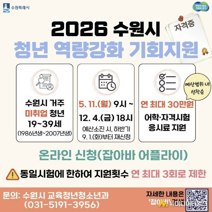 수원특례시는 미취업 청년의 취업 준비 비용 부담을 덜어주는 ‘청년 역량강화 기회 지원 사업’을 12월 4일까지 운영한다. 미취업 청년에게 어학·자격시험 응시료를 1인당 연 최대 30만 원 지원한다.