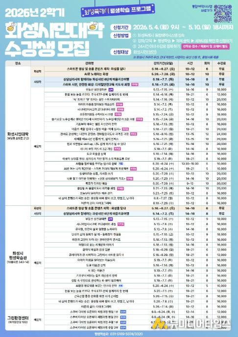 화성특례시는 2026년 화성시민대학 2학기 수강생을 오는 5월 4일부터 5월 10일까지 선착순으로 모집한다고 밝혔다.