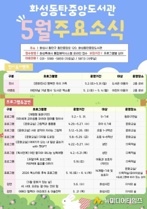 이번 행사는 화성동탄중앙도서관 개관 이후 처음 맞는 어린이날과 가정의 달을 기념해 마련됐다. 5월 2일부터 4일까지는 어린이날 기념 행사 ‘화성동탄중앙도서관 책소풍’을 운영하고, 5월 한 달 동안은 가족 친화형 체험·전시·독서문화 프로그램을 중심으로 다채로운 행사를 이어갈 예정이다.