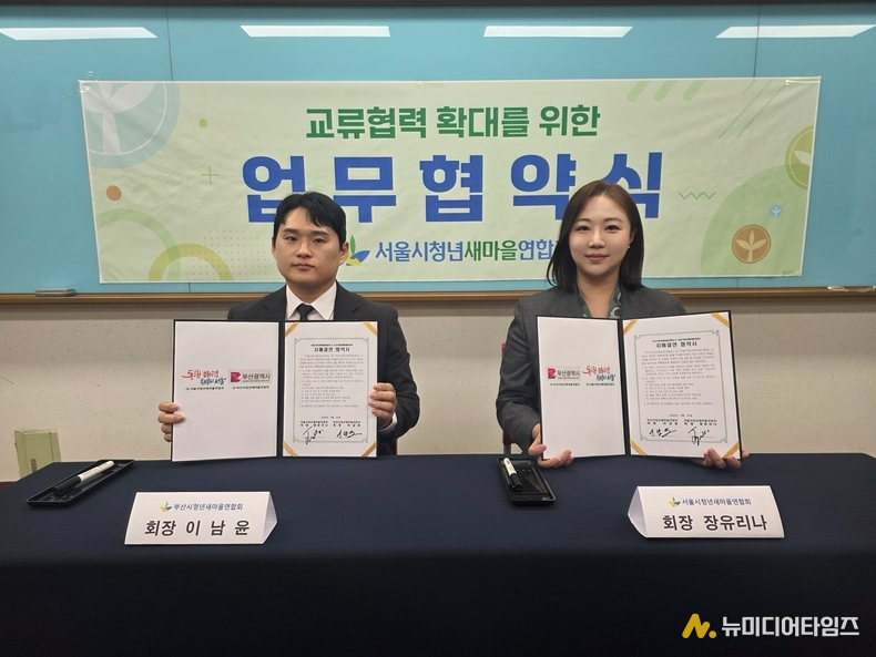 서울시청년새마을연합회(회장 장유리나)와 부산시청년새마을연합회(회장 이남윤)는 지난 4월 22일 새마을운동중앙회 제2강의실(경기 성남시)에서 자매결연 협약을 체결하고, 수도권 청년 새마을 조직 간 협력체계 구축에 나섰다. 이번 협약은 청년 중심의 새마을운동을 확산하고, 지역 간 연대와 공동 발전을 도모하기 위한 것으로, 양 기관은 상호 존중과 신뢰를 바탕으로 지속가능한 협력 모델을 구축하는 데 뜻을 모았다.