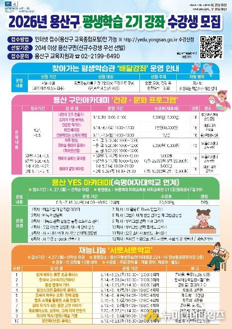 서울 용산구가 구민의 자기계발과 평생학습 참여 기회 확대를 위해 ‘2026년 평생학습 2기 강좌’를 본격적으로 운영하고, 수강생 모집에 나섰다.