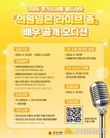 경기도의회는 2026년도 경기도의회 웹드라마 ‘의원님은 라이브 중(가제)’에 출연할 배우를 공개 모집하기 위해 오디션을 개최한다.